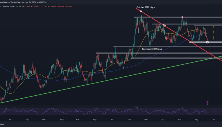 The Canadian dollar has appreciated sharply against the U.S. dollar since late May. The chart below shows how USD/CAD has fallen more than 2.0% over the past two weeks, with the pair now trading near C$1.3350 and steadily approaching its 2023 lows.