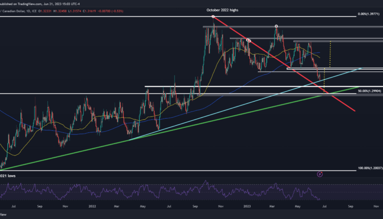 If USD/CAD breaches trendline support at 1.3150 in a clean and clear break on daily closing basis, sellers are likely to take undisputable control of the market, setting the stage for the next leg lower of the double top bearish projection (see chart). This could imply a move toward 1.3080 ahead of a possible retest of 1.2990, the 50% Fibonacci retracement of the June 2021/October 2022 rally.