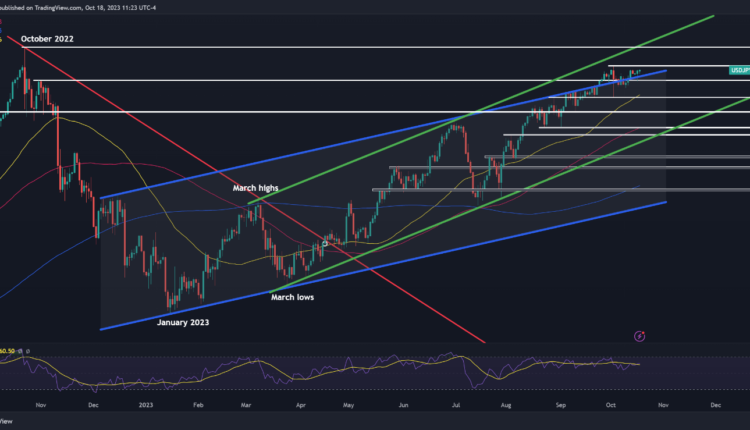 The U.S. dollar traded higher against most peers on Wednesday amid risk-off sentiment. Compared to the Japanese yen, however, the greenback was largely flat, with USD/JPY fluctuating around the 149.75 level at the time of writing. The ongoing geopolitical conflict in the Middle East, stemming from Hamas attacks in Israel, continued to shape market dynamics, forging a challenging environment for riskier currencies. This article provides an in-depth analysis of where the prices of USD/JPY, AUD/USD, and USD/MXN may be headed.