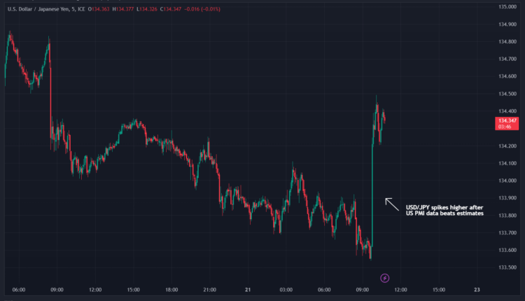 - USD/JPY jumps after U.S. PMI data surprises to the upside