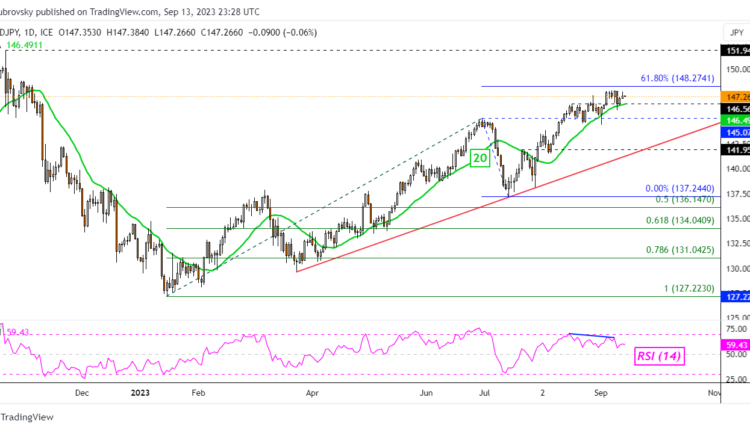 The US Dollar has slowed its upside progress against the Japanese Yen of late. On the daily chart below, USD/JPY can be seen leveling off just under the 61.8% Fibonacci extension at 148.27, which is immediate resistance. Meanwhile, key support is the 146.56 inflection point from early August. In recent days, negative RSI divergence has emerged.