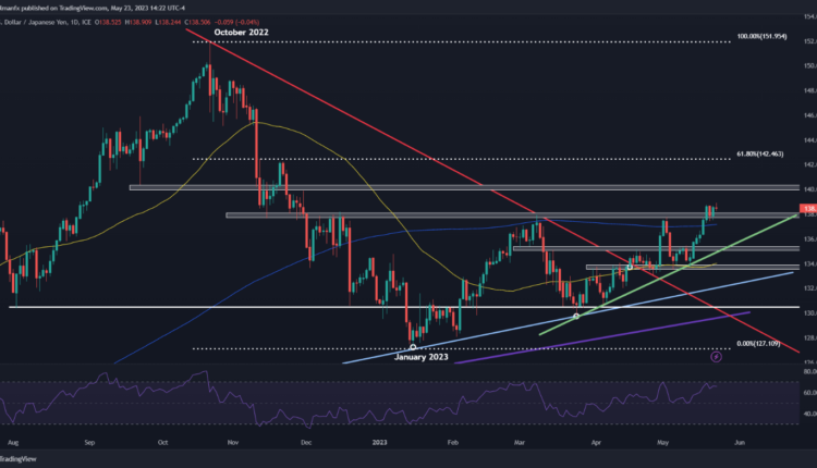 While USD/JPY’s technical outlook remains constructive, the pair may be in a consolidation phase for a few days, establishing a base around the 138.00 handle prior to the next leg higher. If this scenario plays out, prices may resume their ascent and challenge the psychological 140.00 level before the end of May. On further strength, the focus turns to 142.45, the 61.8% Fib retracement of the 2022/2023 slump.