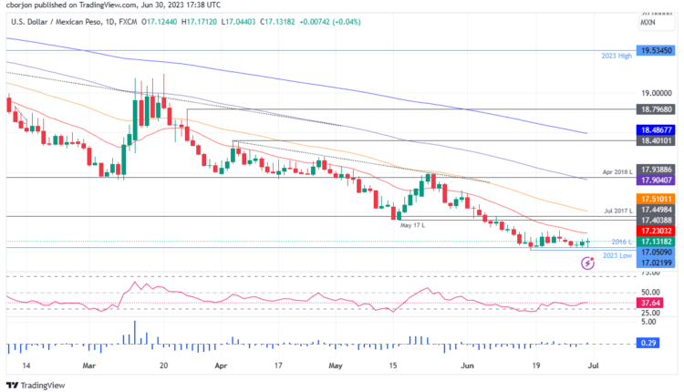 Regarding central banks and expectations for monetary policy, the Fed is foreseen to raise rates in July, with odds at 87%, as reported by the CME FedWatch Tool. However, estimates for an additional quarter of percentage raise in November slid compared to yesterday’s odds at around 36%. The Bank of Mexico (Banxico) is expected to keep rates unchanged after two back-to-back meetings holding rates at 11.25%. That said, the interest rate differential still favors the MXN; hence further downside is expected in the USD/MXN pair.