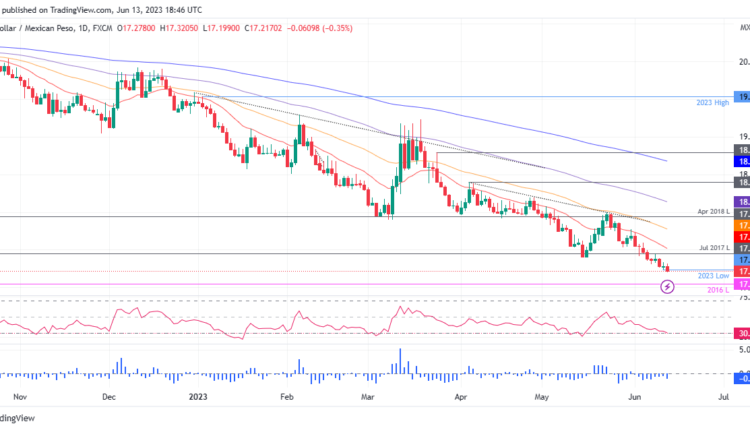 USD/MXN tumbles to fresh seven-year lows, achieved during the last six trading days, courtesy of US Dollar (USD) weakness. A US inflation report sent the US Dollar sliding against most G10 FX peers, alongside the Mexican Peso (MXN). At the time of writing, the USD/MXN is trading at 17.2164, down more than 0.30%.