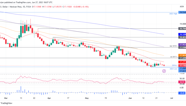 The Mexican Peso (MXN) shrugs off the second interest rate pause by the Bank of Mexico (Banxico), advancing against the US Dollar (USD) as the USD/MXN trades with a negative tone, down 0.15%. The USD/MXN trades with losses after hitting a daily high of 17.1400, exchanging hands at 17.070.
