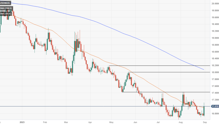The exotic pair rallied sharply and touched a daily high of 17.1114 before reversing its course below the 17.0000 mark. However, traders are eyeing a daily close above 17.0000, with USD/MXN buyers setting their sights on the 100-day Moving Average (DMA) at 17.3072.