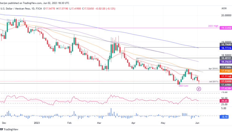 The USD/MXN dropped sharply from around 17.5000s toward the lows of the week of 17.4190 after the US Bureau of Labor Statistics (BLS) revealed Nonfarm Payrolls in May crushed analysts’ estimates of 190K, with the economy adding 339K jobs. Although the headline figure is impressive, digging a little deep, the Unemployment Rate jumped from 3.4% to 3.7%. Regarding wages, inflation, known as Average Hourly Earnings, rose 0.3% MoM but edged down from April 4.4% to 4.3%.