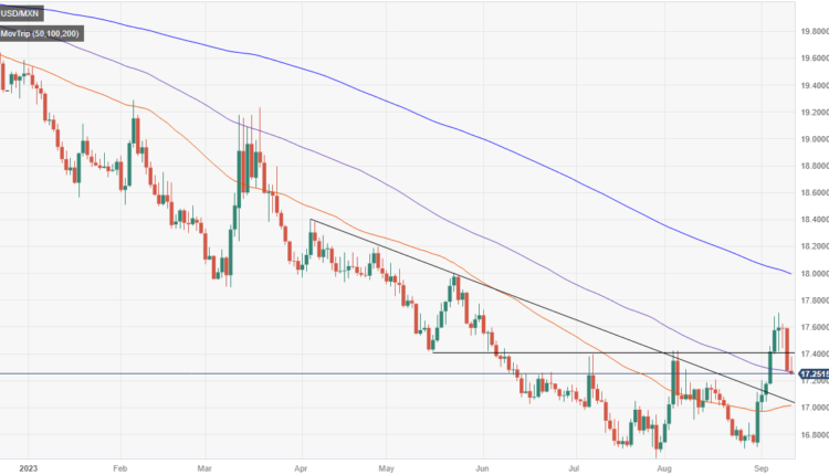 From a daily chart perspective, the pair is challenging technical support at the 100-day Moving Average (DMA) at 17.2558, which capped the USD/MXN drop. A daily close below the latter, and the pair could test the 20-DMA at 17.0929 before slumping toward the psychological 17.0000 price level. For an upward resumption, the exotic pair must reclaim the 17.5000 area before testing the September 11 high at 17.5927.