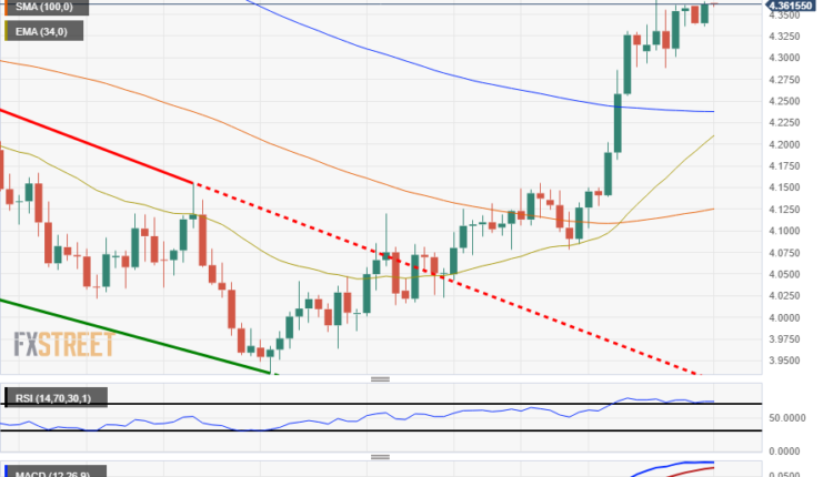 The 200-day Simple Moving Average is currently providing support from 4.2377, and the 34-day Exponential Moving Average is racing to cross over into a bullish confirmation, currently pricing in near 4.2100.
