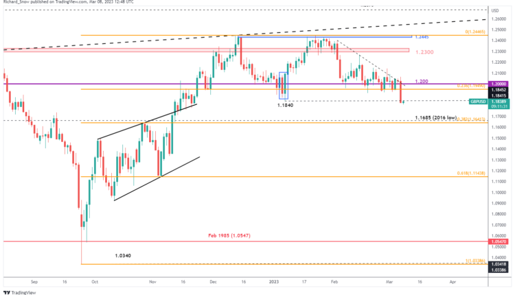 GBP/USD traded through not only the psychological 1200 level but also the 23.6% Fibonacci retracement of the 2022 move and thus far, is holding below the Jan swing low of 1.1840. With few signs of a pullback, cable appears vulnerable to more selling but today’s close will be telling. Support appears at the 2016 low of 1.1685, followed closely by the 38.2% retracement at 1.1640. Immediate resistance appears at 1.1840, followed by 1.1949 and 1.2000.