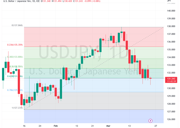 The pair is currently finding support at the fourth Fibonacci retracement of its rise up to the highs of March 8 from the lows of January 16. That comes in at 131.264 and it has so far held on a daily closing basis despite being probed by Dollar bears in the last four sessions. They have managed to nudge the pair below it in intraday trade, however, and the level remains very close to the current market and under clear threat.