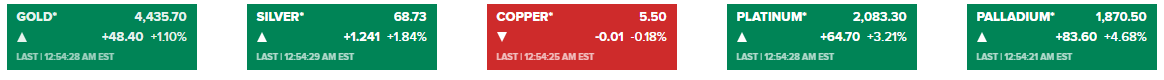 Giá bạc tăng mạnh tới 2.7%, lên mức kỷ lục 68.9883 USD/oz, được hỗ trợ bởi dòng vốn đầu cơ và tình trạng gián đoạn nguồn cung kéo dài tại các trung tâm giao dịch lớn. Khối lượng giao dịch hợp đồng bạc kỳ hạn tại Thượng Hải đã tăng vọt trong tháng này, tiệm cận các mức từng ghi nhận trong giai đoạn căng thẳng cách đây vài tháng.