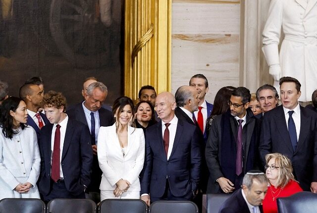 Từ trái qua: CEO Meta Mark Zuckerberg, bà Lauren Sanchez cùng nhà sáng lập Amazon Jeff Bezos, CEO Google Sundar Pichai và CEO Tesla Elon Musk đã tham dự lễ nhậm chức của ông Donald Trump vào tháng 1.