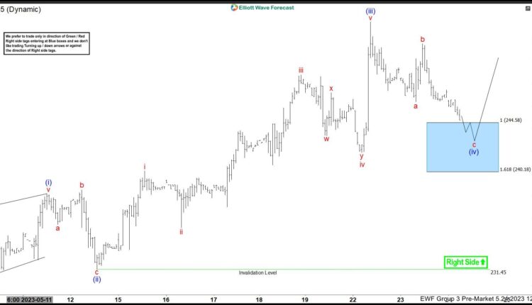 As we can see the market was marginally above within blue box area of 244.58 – 240.18 and we have been expecting a dip to reach the area. We recommend members to always buy from the 100% extension area with a stop loss just below the 1.618 area. Fast forward, towards the latest post market update now from 05.26.2023, we will see that the market has already reacted higher and what we expect next.