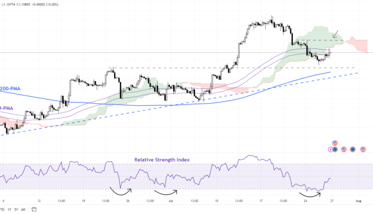 EUR/USD on Wednesday held above stiff support around an uptrend line from early June, near the 200-period moving average on the 4-hour chart. Still, it would be too soon to conclude that the immediate bearish pressure has alleviated – the pair would need to clear the initial hurdle at Monday’s high of 1.1150. Until then, the bias appears to be of consolidation within a broadly constructive outlook. As highlighted in the previous update, only a fall below the mid-July lows of 1.0825 for the broader upward pressure to ease.