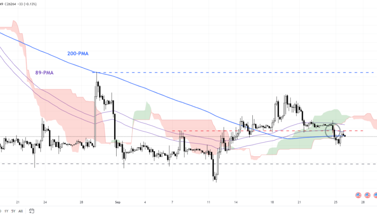 The subsequent fall below crucial converged support at the September 15 low of 26250, coinciding with the lower edge of the Ichimoku cloud and the 89-period moving average on the 240-minute charts confirms that the upward pressure has faded. The break below support has opened up the possibility of two scenarios. BTC/USD could settle in a 24750-27500 range; the second scenario involves a retest of the June low of 24750.