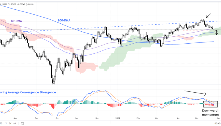 In the past couple of weeks, there have been signs of loss of steam in GBP/USD’s rally (see “A Reversal or a Dead-Cat Bounce in US Dollar? EUR/USD, GBP/USD, USD/JPY”, published May 17. This follows a retreat earlier this month from a slightly upward sloping trendline from 2022 (see the weekly chart).