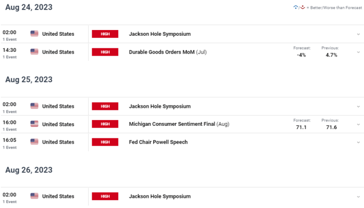 The Jackson Hole Economic Symposium for 2023 will run from the 24 – 26 August (see economic calendar below) and although other central bank and economic leaders will be present, Fed Chair Jerome Powell’s address is the one to watch. The theme for this year is titled ‘Structural Shifts in the Global Economy’; a pertinent topic as banks look to move away from a high interest rate environment as many major economies begin to slow.