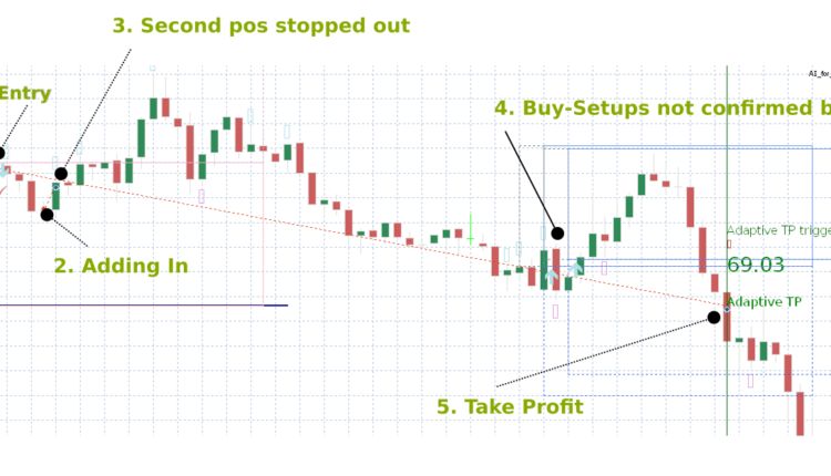 - Later, two buy-setups have been detected. These however where not confirmed by the AI-filter. So no buy position has been opened. Luck for us!
