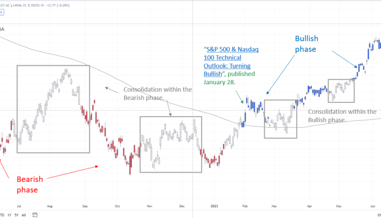 From a directional perspective, the trend remains up for the Nasdaq 100 and the S&P 500 index, as the colour-coded daily candlestick charts show. Moreover, in recent weeks, the uptrend has become more entrenched, looking at momentum on the daily and weekly charts, thanks to the raising of the US debt ceiling and the resilience of the global economy, as recent updates have highlighted. SeeMay 6,May 15, andMay 18updates.