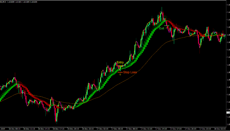 The 50 EMA line and the Heiken Ashi Smoothed indicator is used to identify the direction of the trend. This is based on the location of the Heiken Ashi Smoothed bars in relation to the 50 EMA line, as well as the color of the Heiken Ashi Smoothed bars. Trends should also be visually confirmed by the trader based on the behavior of price action.