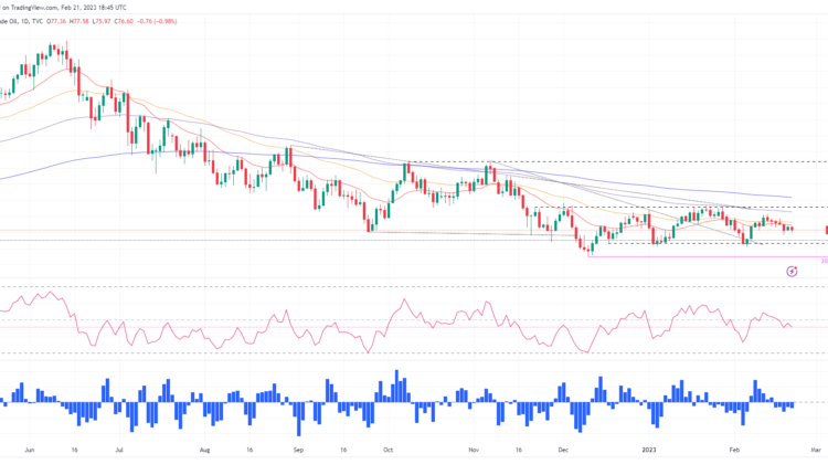 Western Texas Intermediate (WTI), the US crude oil benchmark, is erasing Monday’s gains which fell shy of reaching the 20-day Exponential Moving Average (EMA), and dropped towards the lows of the week around 75.97 before settling around the current price. At the time of typing, WTI is losing 0.94%, trading at 76.64 per barrel.