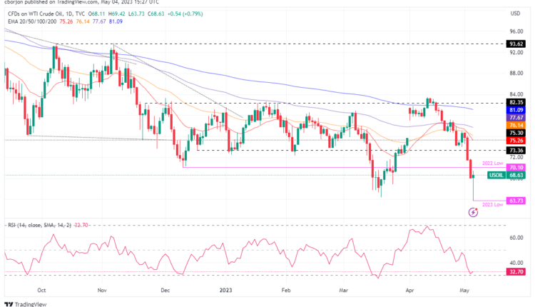 Western Texas Intermediate (WTI), the US crude oil price, had shrugged off a $6.00 fall during the Asian session and is trading above its opening price. Two major central banks’ decisions weighed WTI’s price, though buyers moved in and lifted prices. At the time of writing, WTI is exchanging hands at $68.72 PB, gains almost 1%.