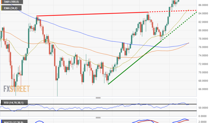 A rising trendline from late June's lows near $67.00 remains in place, and bullish momentum is currently running far away from the technical pattern.