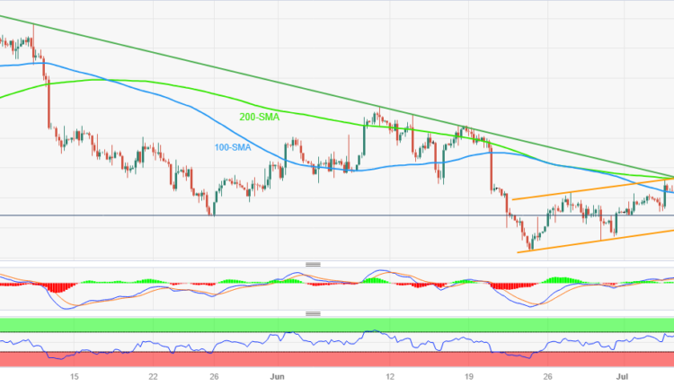 In doing so, the XAG/USD seesaws within a fortnight-old bullish channel, approaching the bottom line of the bullish chart formation of late.