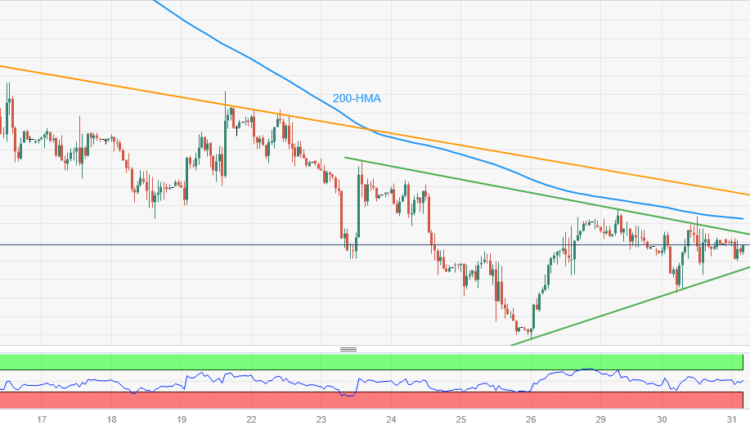 Additionally, the steady RSI (14) line suggests a further zigzag of the XAG/USD price within a triangle as the bullion sellers slowly tighten their grip.