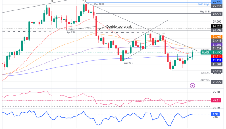 The XAG/USD extended its recovery, though it remains below technical resistance levels, which, once cleared, could pave the way for further upside. The first resistance is the 20-day Exponential Moving Average (EMA) at $23.10, followed by the confluence of a downslope resistance trendline and the 50-day EMA at around $23.46. Break above will expose the June 16 daily high at $24.20. Conversely, a drop below $23.00 would keep sellers in charge and exacerbate a fall to the June 23 swing low of $22.11.