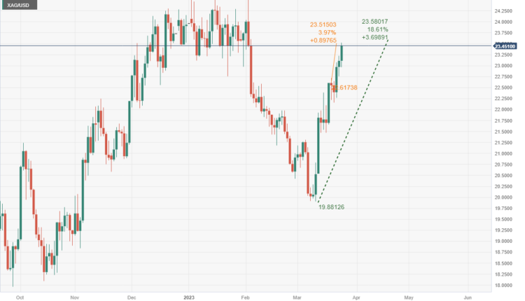 Since the beginning of the week, XAG/USD has gained 4% and from the March 10 low, almost 20%. Price is testing a relevant technical area and a consolidation above $23.50 could keep the road to more gains clear, even as technical indicators show extreme overbought conditions.