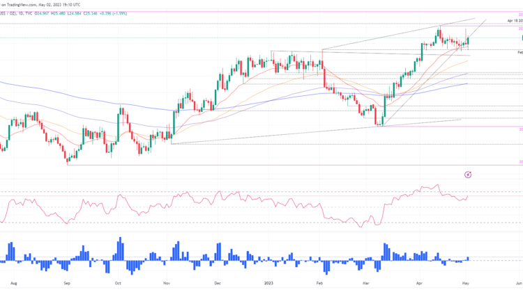 The XAG/USD daily chart shows the white metal edged toward its May high at $25.90 on Monday before reversing its course and closing below the $25.00 figure, a tick above the 20-day Exponential Moving Average (EMA). Even though the Silver price was headed to continue to fall, it jumped off the daily low of $24.58, $0.30 below the 20-day EMA, and climbed to the bottom of an upslope support trendline drawn from March 2023 lows.