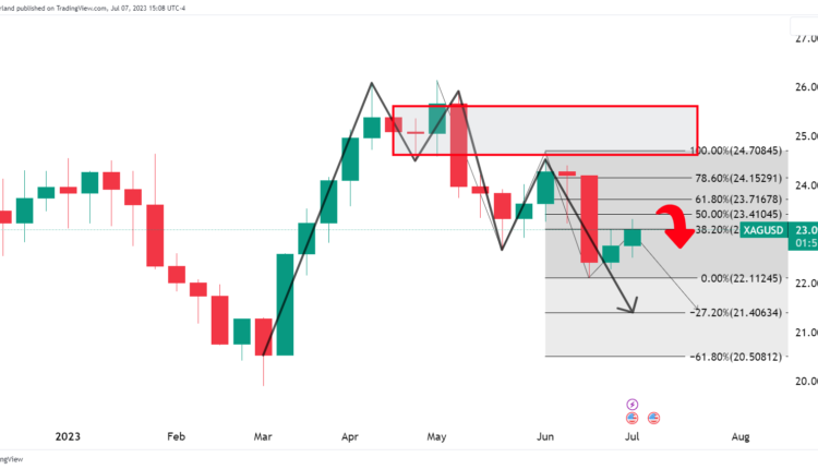 At the time of writing, XAG/USD is trading at $23.1038 and has travelled between a low of $22.6165 and a high of $23.1545. The following technical analysis arrived at a bearish thesis, however, for the medium and longer-term:
