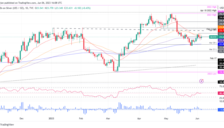 Silver price stopped its fall amidst rising US Treasury bond yields, cushioned by the 100-day Exponential Moving Average (EMA) lying at $23.47. Still, it also failed to rally, capped by solid resistance at around the $23.74-88 area, where the 20 and 50-day EMAs lie. Therefore, XAG/USD is trading at $23.52, almost flat.