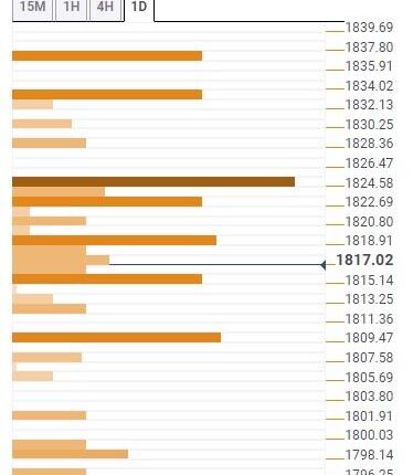 The Technical Confluence Detector shows that the Gold price grinds below the $1,825 resistance confluence which encompasses the Fibonacci 38.2% on one-week and the previous monthly low.