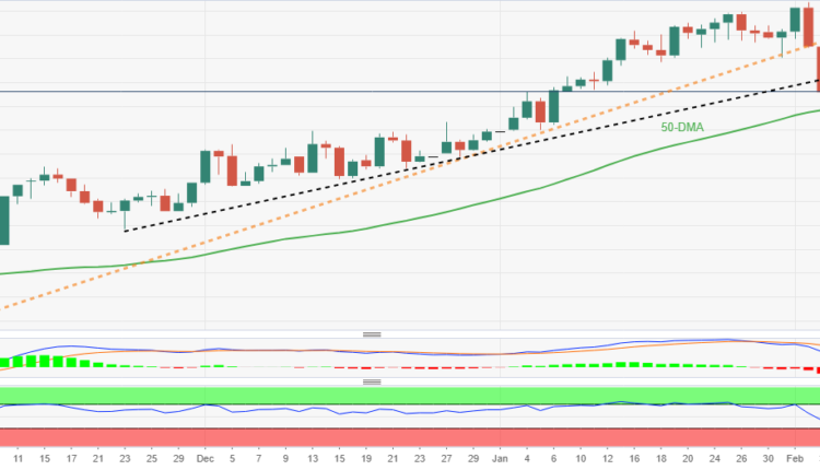 - Gold price justifies downside break of key support line as sellers attack one-month low.