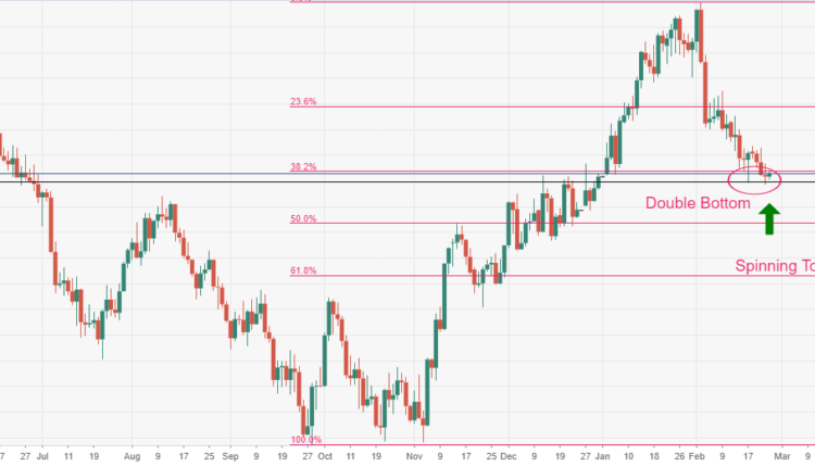 Gold price has formed a Spinning Top candlestick pattern on the daily scale that conveys a reversal due to indecisiveness in the sentiment of market participants after a downside move. The importance of the Spinning Top candlestick formation is meaningful as it has formed near the 38.2% Fibonacci retracement (placed from November 3 low at $1,616.69 to February 2 high at $1.959.71) at $1,829.45.