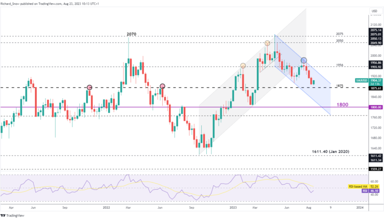 Levels to the downside include the swing low at $1885, with the longer-term level of significance being $1875 for continued downside. Risks to the current gold outlook may arise later this week if Jerome Powell signals a more dovish path on interest rates but thus far has been careful not to give too much away given the unpredictable nature of inflation.