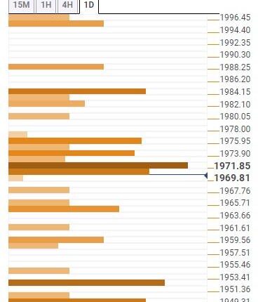 As per our Technical Confluence indicator, Gold Price seesaws around the $1,970 support-turned-resistance confluence comprising the Pivot Point one-month R1, Fibonacci 23.6% on one-day and the middle band of the Bollinger on the four-hour (4H) play.