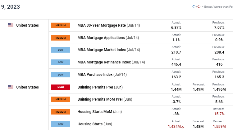 Gold prices are relatively muted this Wednesday after yesterday’s rally as markets mull over weakening US economic data this week in the form of retail sales and building permits (see economic calendar below). Mortgage applications supplemented the current dovish slant with recent figures slipping further due to the Fed’s aggressive monetary policy.