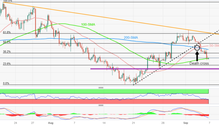 Gold Price justifies the week-start “Death Cross” bearish moving average crossover while declining in the last five consecutive days, backed by the bearish signals from the Moving Average Convergence and Divergence (MACD) indicator. That said, the 50-bar Simple Moving Average’s (SMA) piercing of the 200-SMA portrays the “Death Cross” bearish crossover suggesting further declines in the underlying asset.