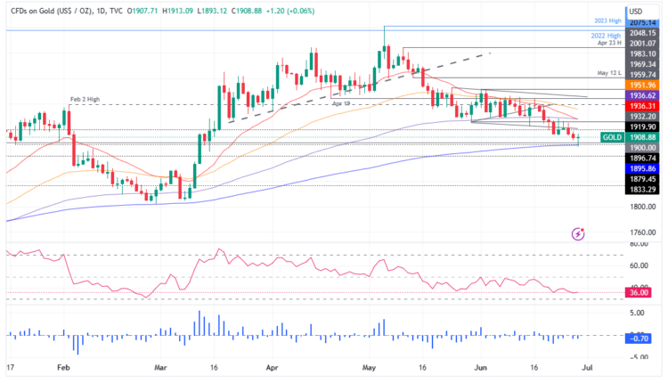 Gold price recovers some ground after sliding below the $1900 figure for the first time since March 15, 2023, gains some 0.09%, after upbeat economic data from the United States (US) increased speculations the Federal Reserve (Fed) would proceed with additional rate hikes. In addition, the data pushed back against “hard landing” prospects, with the economy showing a strong pace of growth. The XAU/USD is trading at $1909.65 after hitting a daily low of $1893.17.