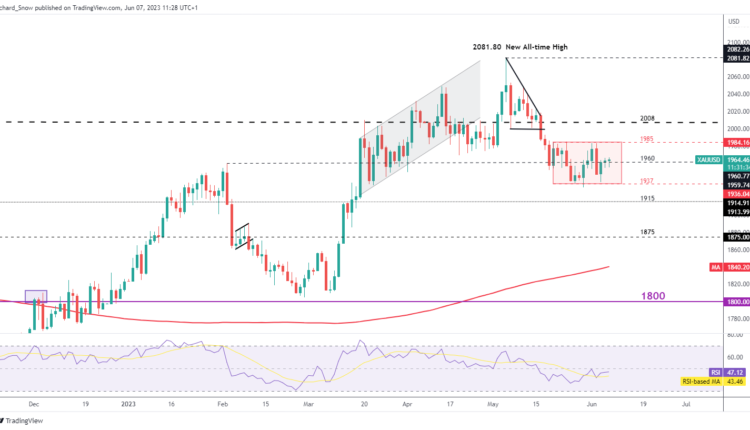 Given that this week brings with it little in the way of high impact economic data, gold prices have been seen drifting within the broader range of 1937 and 1985 and very much in search of its next directional move. A bipartisan agreement to suspend the debt ceiling has reduced the appeal of the safe haven metal in recent trading sessions but the precious metal is yet to show signs of a prolonged sell-off. Next week’s US CPI and FOMC decision are all but set to inject volatility back into the market. If core inflation breaks below the stubborn 5.5%, that could aid the narrative of a more dovish Fed in the coming meetings, lower dollar – which could continue to provide support for gold prices.
