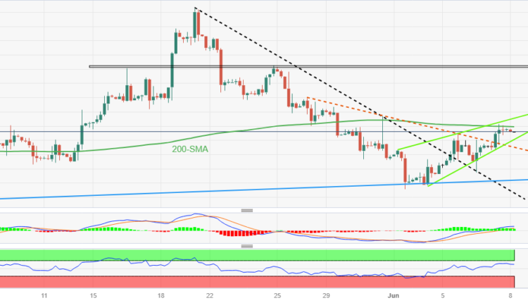 - 200-SMA prods XNG/USD buyers amid nearly overbought RSI conditions.