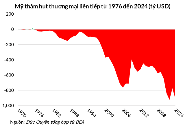 Thống kê của Cục Phân tích Kinh tế Mỹ (BEA) cho thấy Mỹ đã ghi nhận thâm hụt thương mại hàng hóa và dịch vụ liên tục 49 năm từ 1976 đến 2024, với tổng giá trị thâm hụt là 16.8 ngàn tỷ USD.