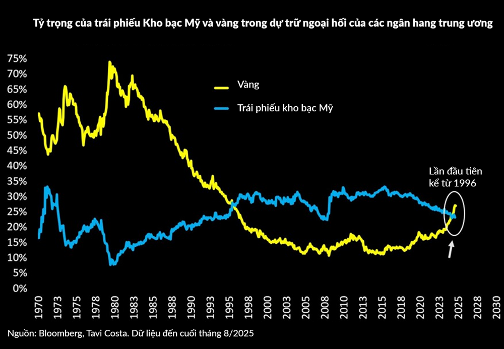 Lần đầu tiên kể từ năm 1996, vàng đã vượt qua USD trong tỷ trọng tài sản dự trữ của các ngân hàng trung ương, một dấu hiệu không thể rõ ràng hơn về sự thay đổi trong trật tự tài chính toàn cầu.