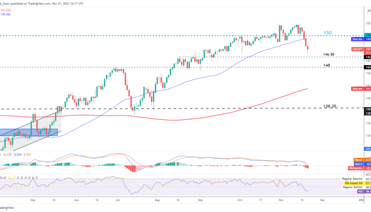 USD/JPY finds support at 146.50, followed by 145.00 . The 50 SMA now forms a potential dynamic resistance if we are to see a pullback, but the bearish move has not breached oversold conditions on the RSI yet so there may still be more room to run before overheating.