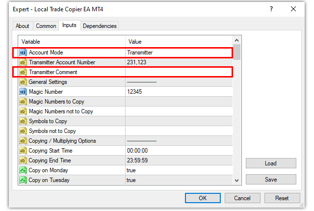 - Synchronized Trade Closure: EA tarafından alıcı hesap(lar)da açılan tüm kopyalanmış alım satımları, verici hesap(lar)daki orijinal alım satımların hemen ardından kapatma seçeneğinin doğru/yanlış'ı kapatılacaktır.