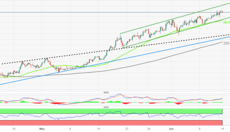• Overbought RSI conditions prod buyers within one-week-old rising trend channel.